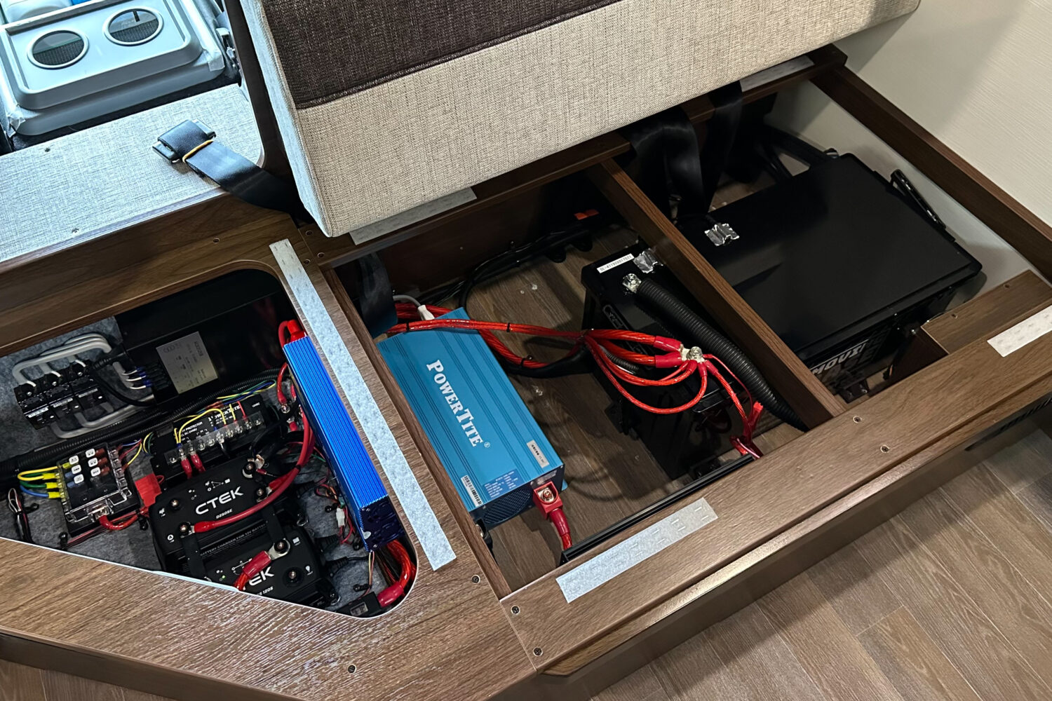 サブバッテリーは鉛バッテリーから実用性のあるリチウムイオンバッテリーで容量は460Ahを設置しています。460Ahあれば使用環境にもよりますが、エアコンなどは半日程度使用できます。ソーラーも設置されているモデルなので日中日が出定理ればそれほど電気の心配はありません。また走行充電器も強化しているので通常の倍以上の速度で充電が可能です。通常の使用の範囲であれば不自由がない仕様となっています。